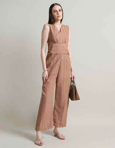 Snatched in the middle, savage everywhere else. 🔥👊 This curve-waist jumpsuit doesn’t fit in these shapes. Smooth lines, strong attitude, and a silhouette that says catch up or get out of the way. Tailored in light taupe poly-cotton with v-neckline and a cinched waist for definition.